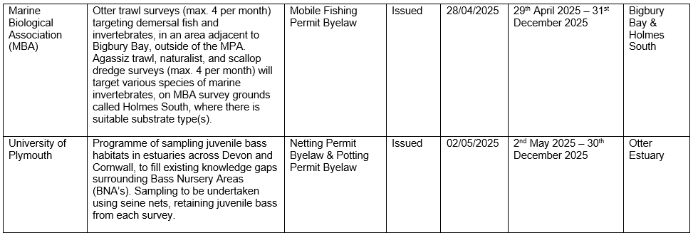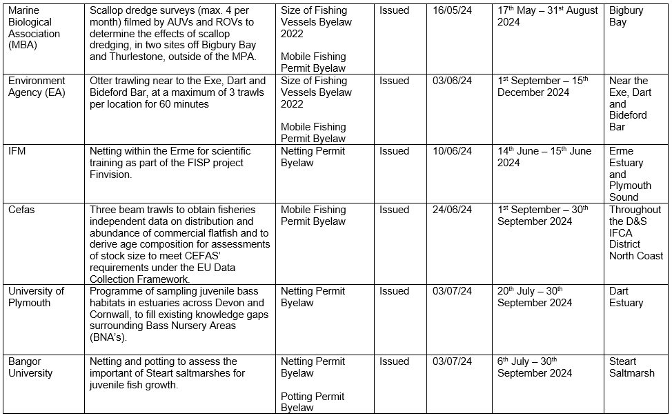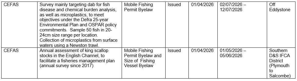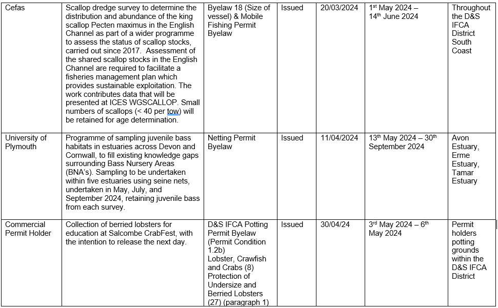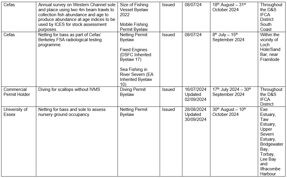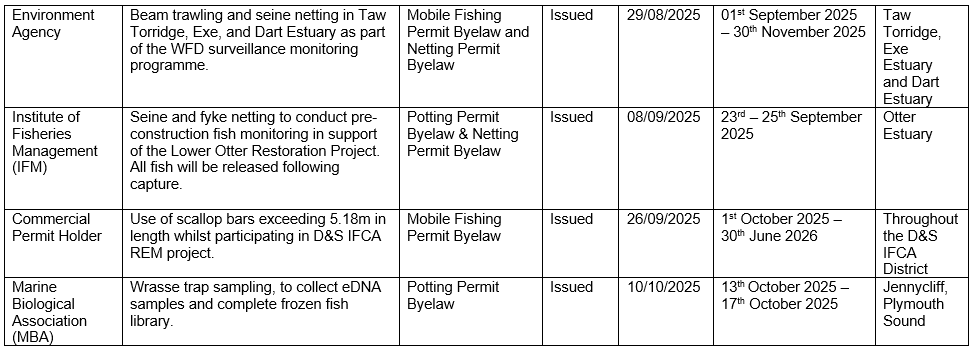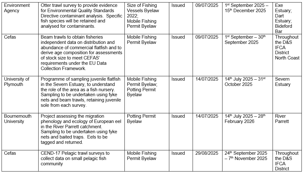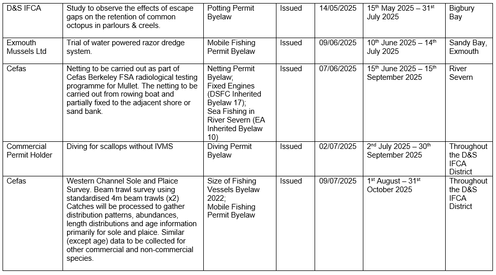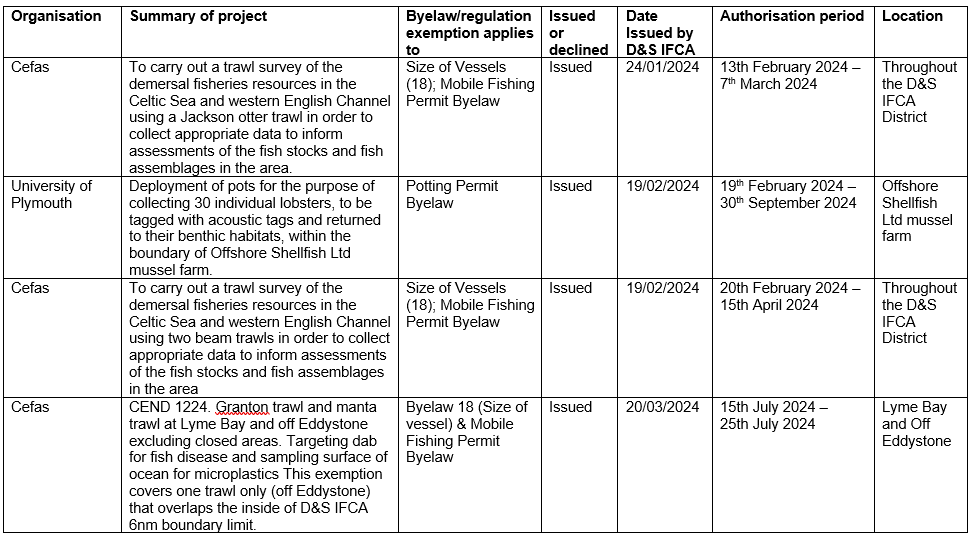 The table/s below provide some details of the authorisations (exemptions) issued by D&S IFCA.