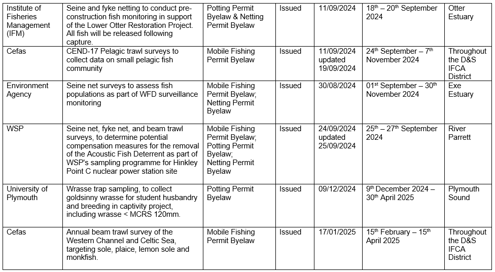 Applications (under the Exemptions Byelaw 2019) for scientific, stocking or breeding purposes are typically requested by organisations such as Cefas, the Environment Agency, or researchers working for universities. This may relate, for example, to scientific surveys with nets, pots or other fishing gear within the District, otherwise than in accordance with a Permit. Requests can be made using the application form that can be downloaded using the links below. The application form can also be provided by contacting D&S IFCA’s Office.